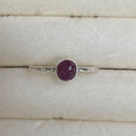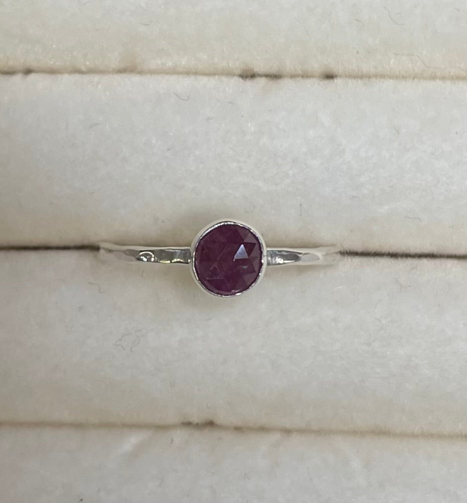 Each piece is meticulously handmade in our UK workshop, ensuring quality craftsmanship and uniqueness. The hammered silver band adds texture and sparkle, while the 5mm round rose-cut ruby stone adds a touch of luxury.