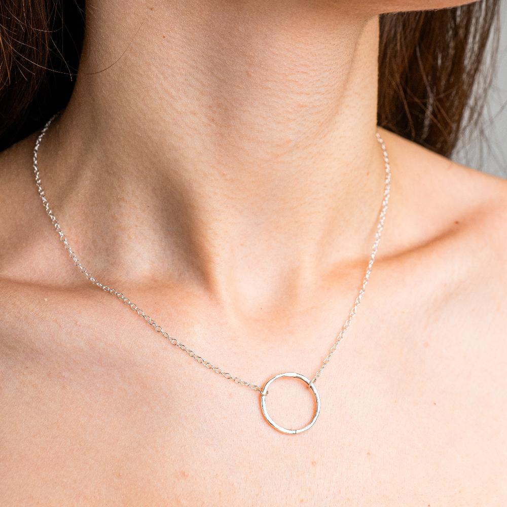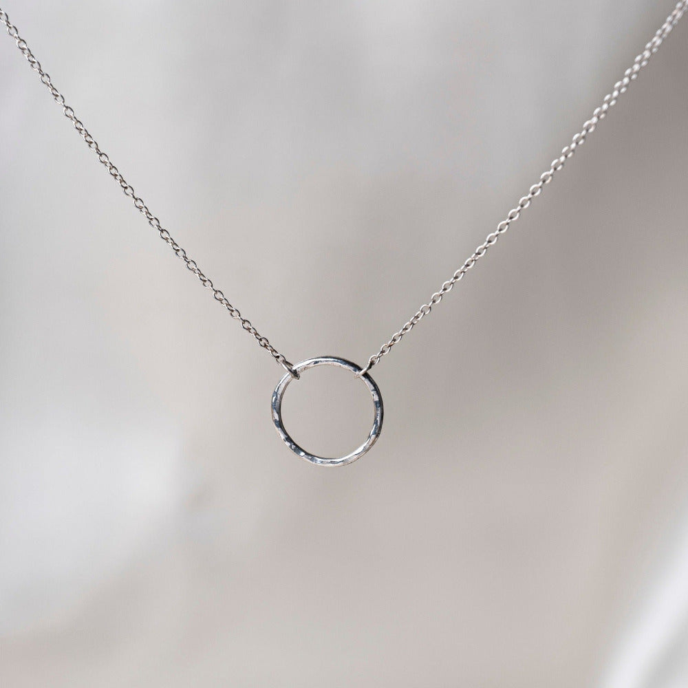 Enhance your style with our Lunar Sterling Silver Necklace, featuring a unique single circle pendant with a stunning Hammered texture. Handcrafted from high-quality Sterling Silver, the Lunar Necklace exudes timeless elegance and sophistication.